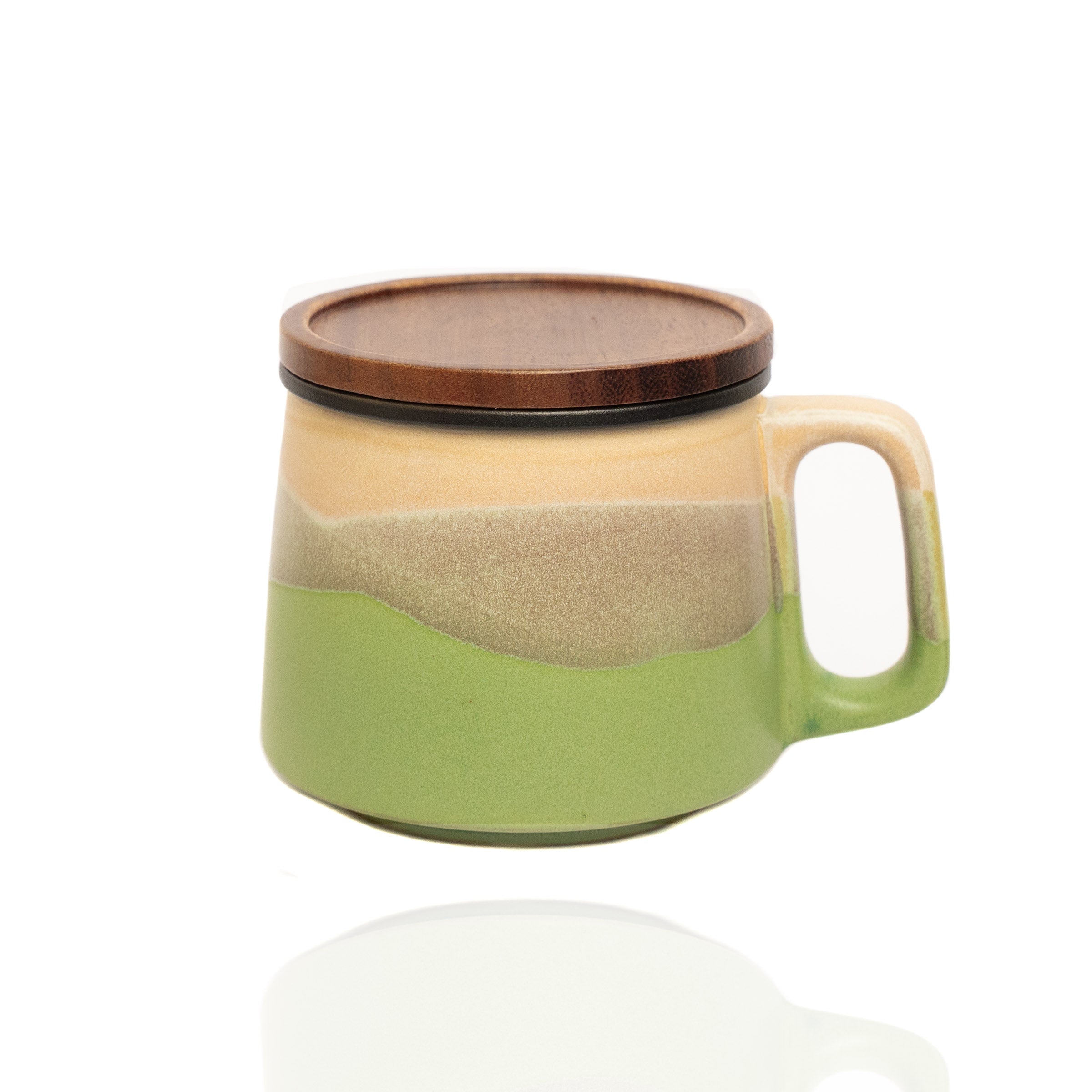 Hand holding a ceramic mug with a layered design, featuring green, beige, and brown colors.