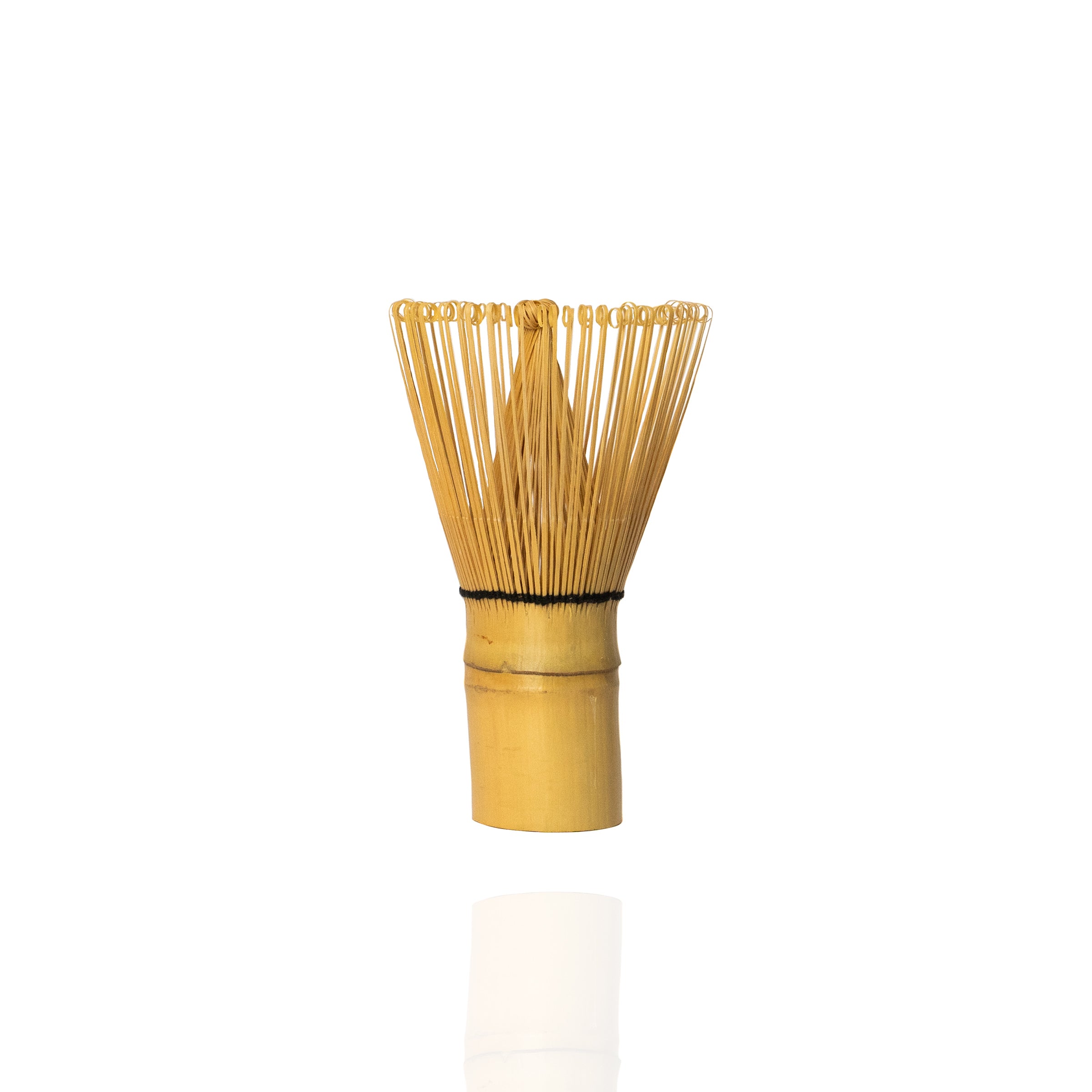 Set of Japanese tea-making tools including a whisk, bowl, and spoon on a white background