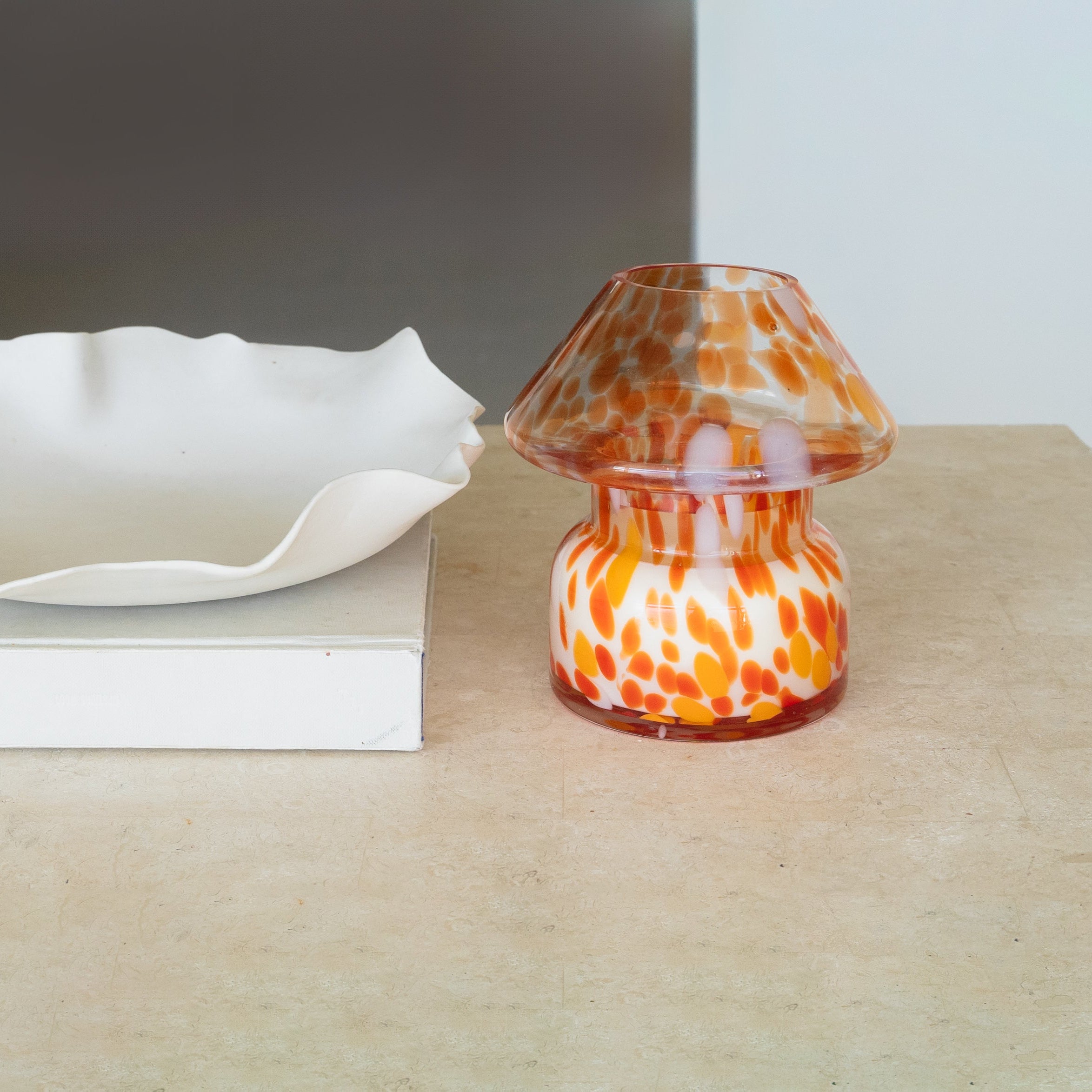 Mushroom candle lamp with red, orange and white spots on clear glass. Retro lamp is filled with 100% soy wax
