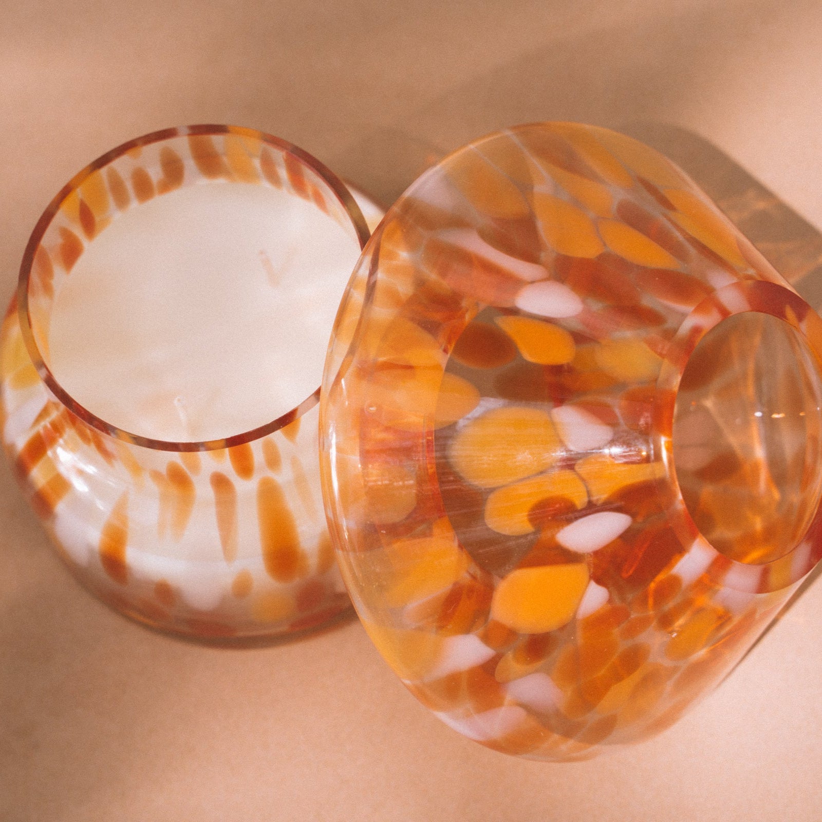This Retro candle lamp has red, orange, yellow and white markings throughout the glass. Every print is different and unique with differing colour density. Our candles are hand poured in Byron Bay.