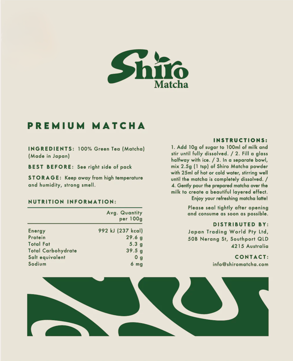 From the foothills of Mt. Fuji, Shiro Matcha Wabi is crafted from premium first and second flush tea leaves, harvested in spring and summer for a smooth balance of umami, sweetness, and gentle bitterness. Deep-steamed using traditional methods, it delivers a vibrant green colour, refined aroma, and full-bodied flavour with minimal bitterness.