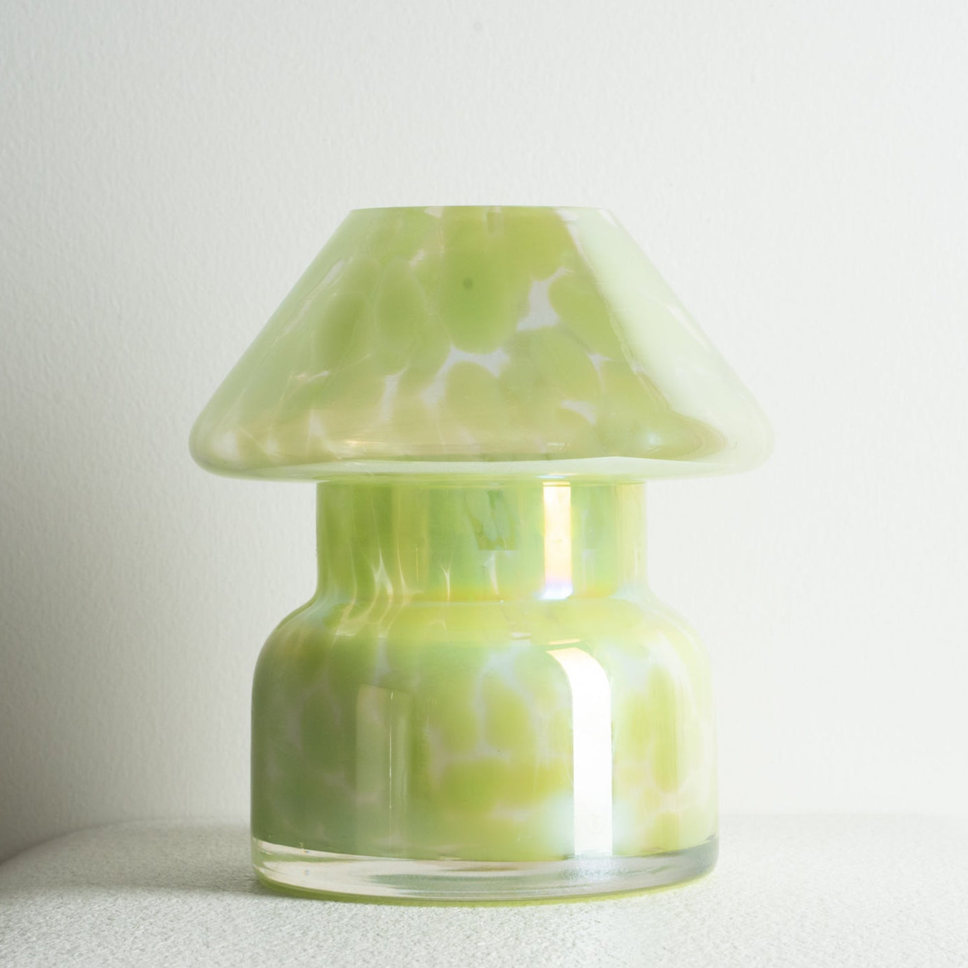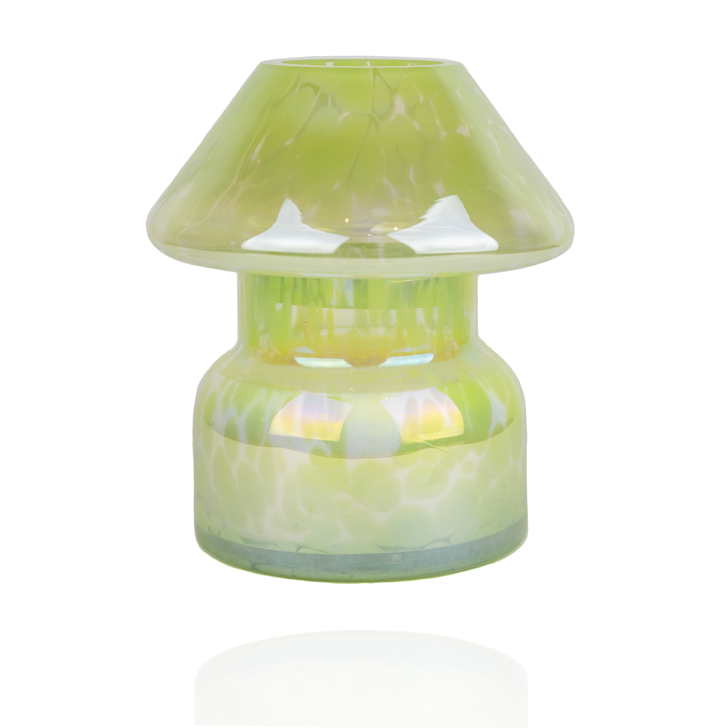 Our Fairy Green candle lamp has soft green markings and also has a pearlescent rainbow tint. Every print is different and unique with differing tint and colour density. Our candles are hand poured in Byron Bay.