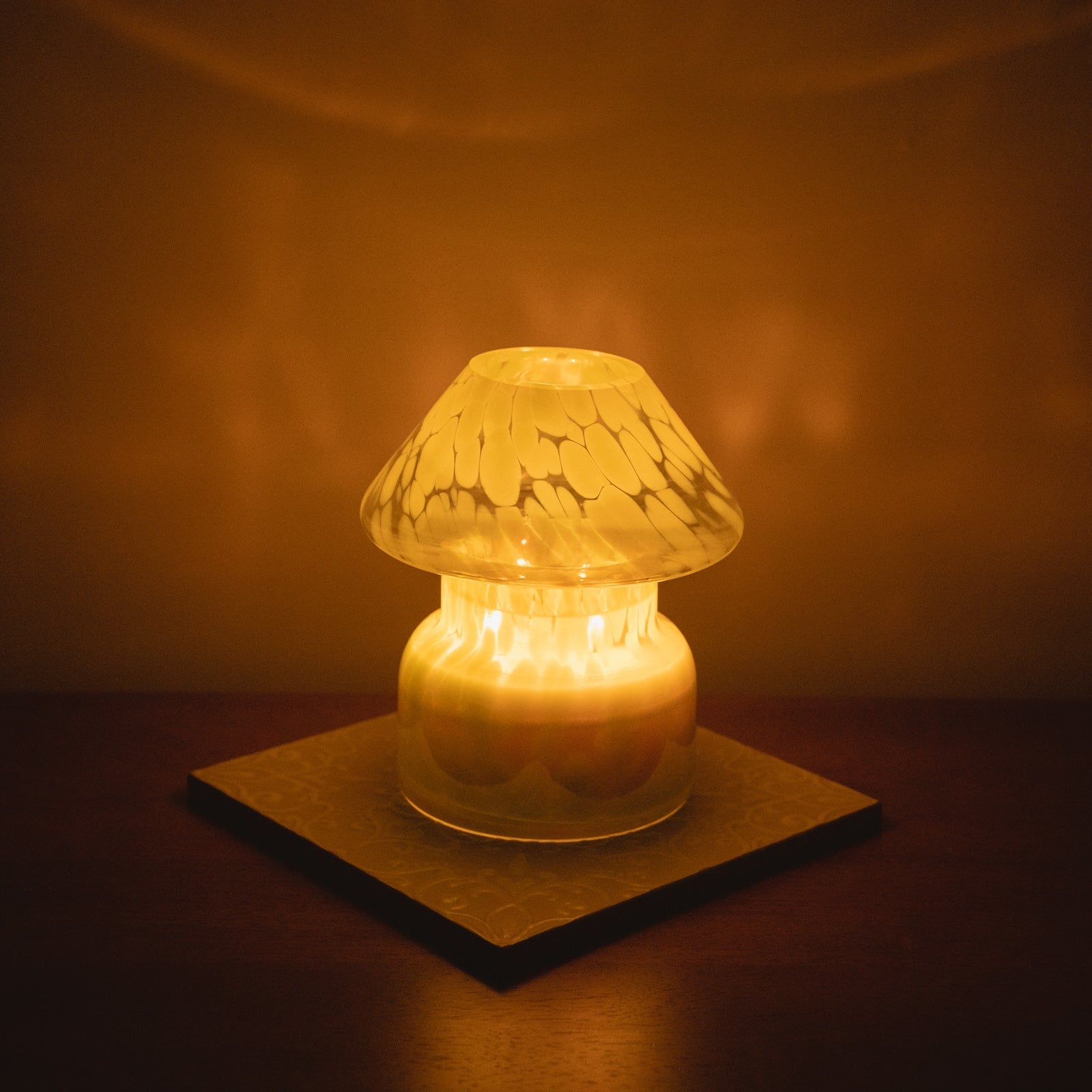 This jar has been hand moulded with glass to be heat resistant, then hand cast to create the top. This glass candle lamp has been tinted to give it an opal effect.