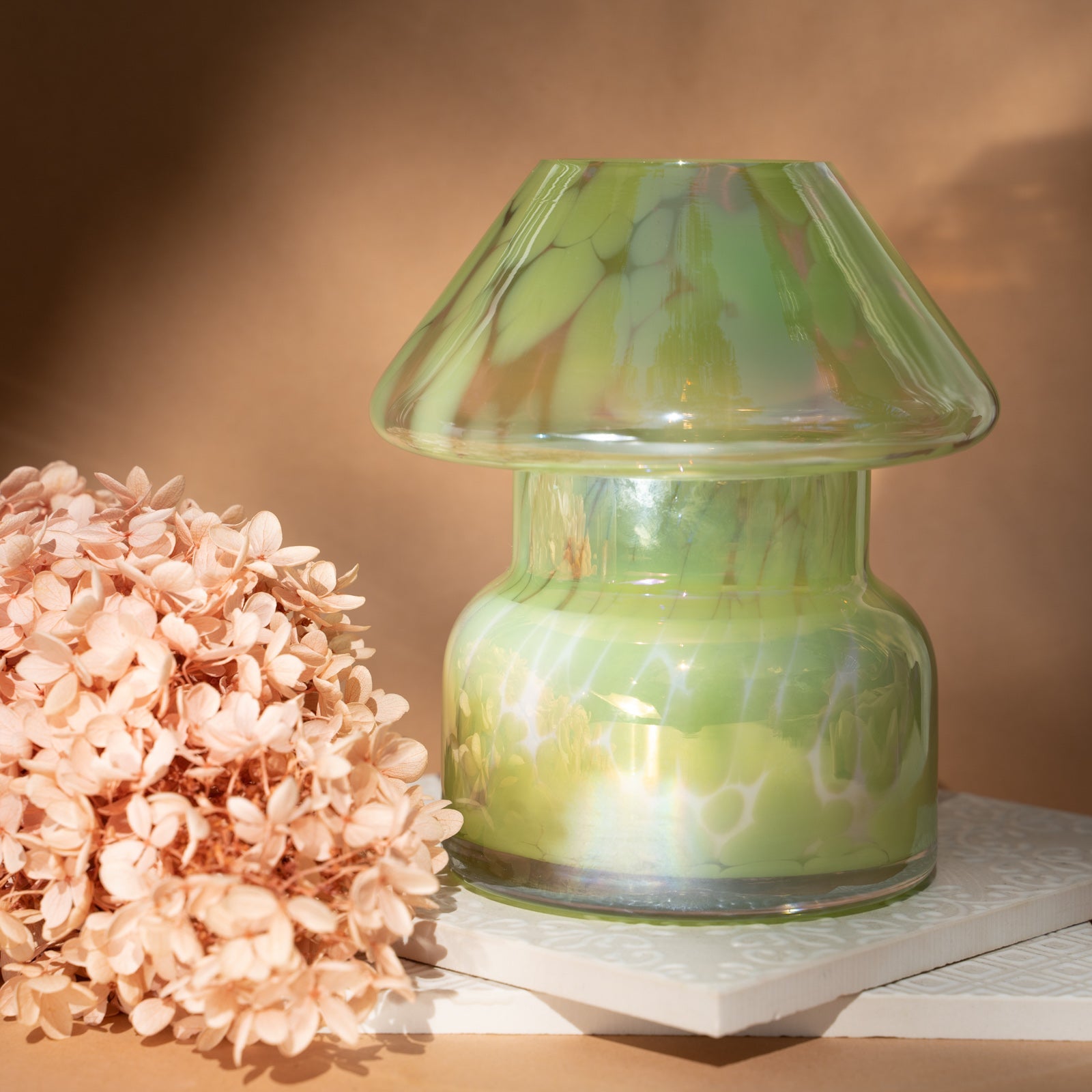 Our sustainable candle lamp is a unique piece that spices up any decor. With a retro aesthetic, mushroom-shaped glass construction, and a 100% soy wax candle inside, this lamp will fill your home with a luxurious aroma. Let a flame or sunbeam pass through the glass and marvel at the beautiful shades of light in your space. When the candle has been used, place our candle refills in and keep your lamp twinkling and your home smelling divine. Or, use it as a vase and inject a burst of color with fresh flower cuttings.