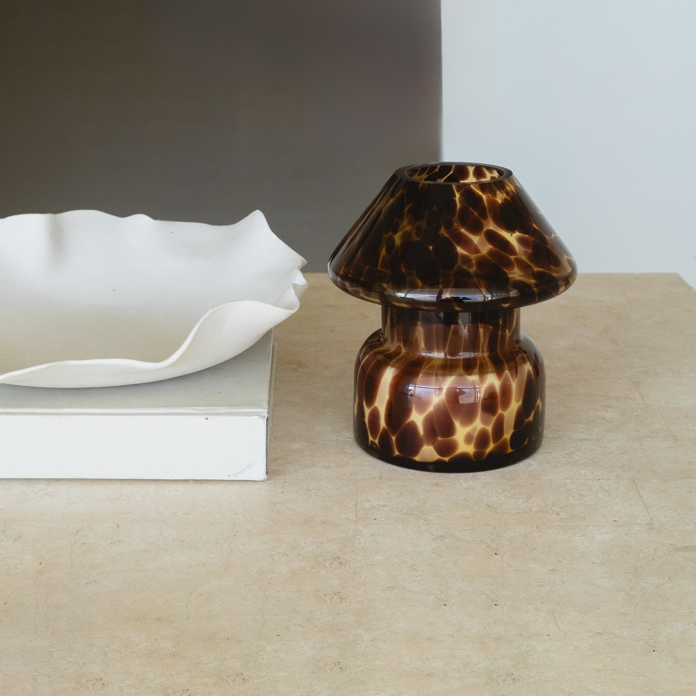Mushroom candle lamp with light and dark brown spots on tan coloured glass. Leopard candle lamp is filled with 100% soy wax