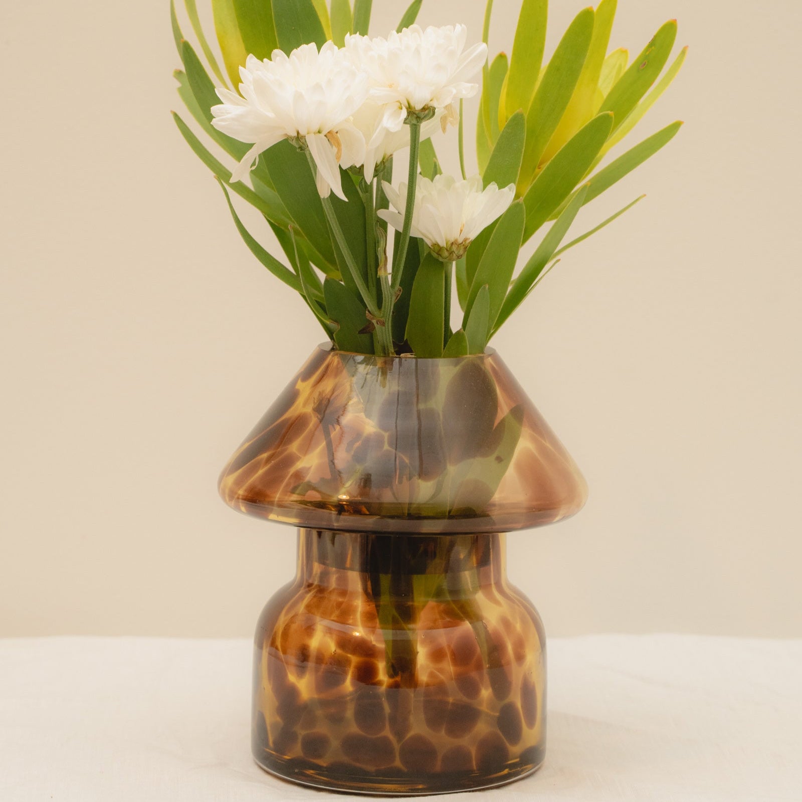 Mushroom candle lamp with light and dark brown spots on tan coloured glass. Leopard candle lamp is filled with 100% soy wax next to dried flowers.