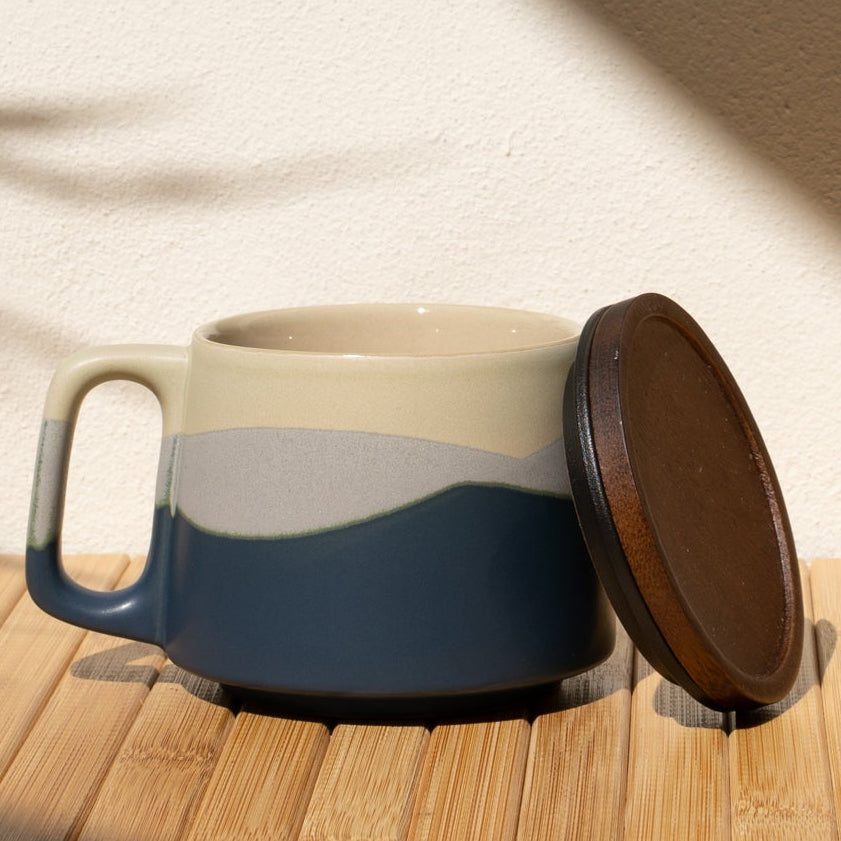 Ceramic mug with wooden lid on a wooden surface with a beige wall background