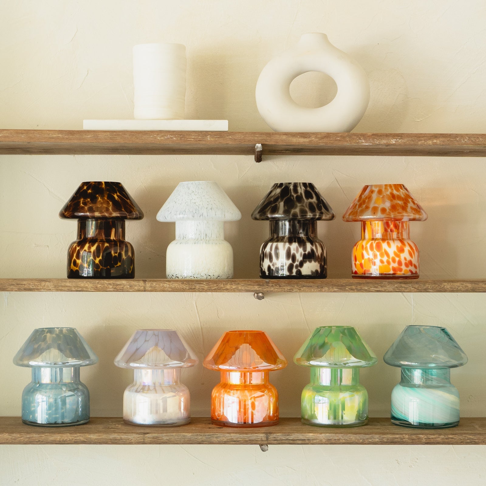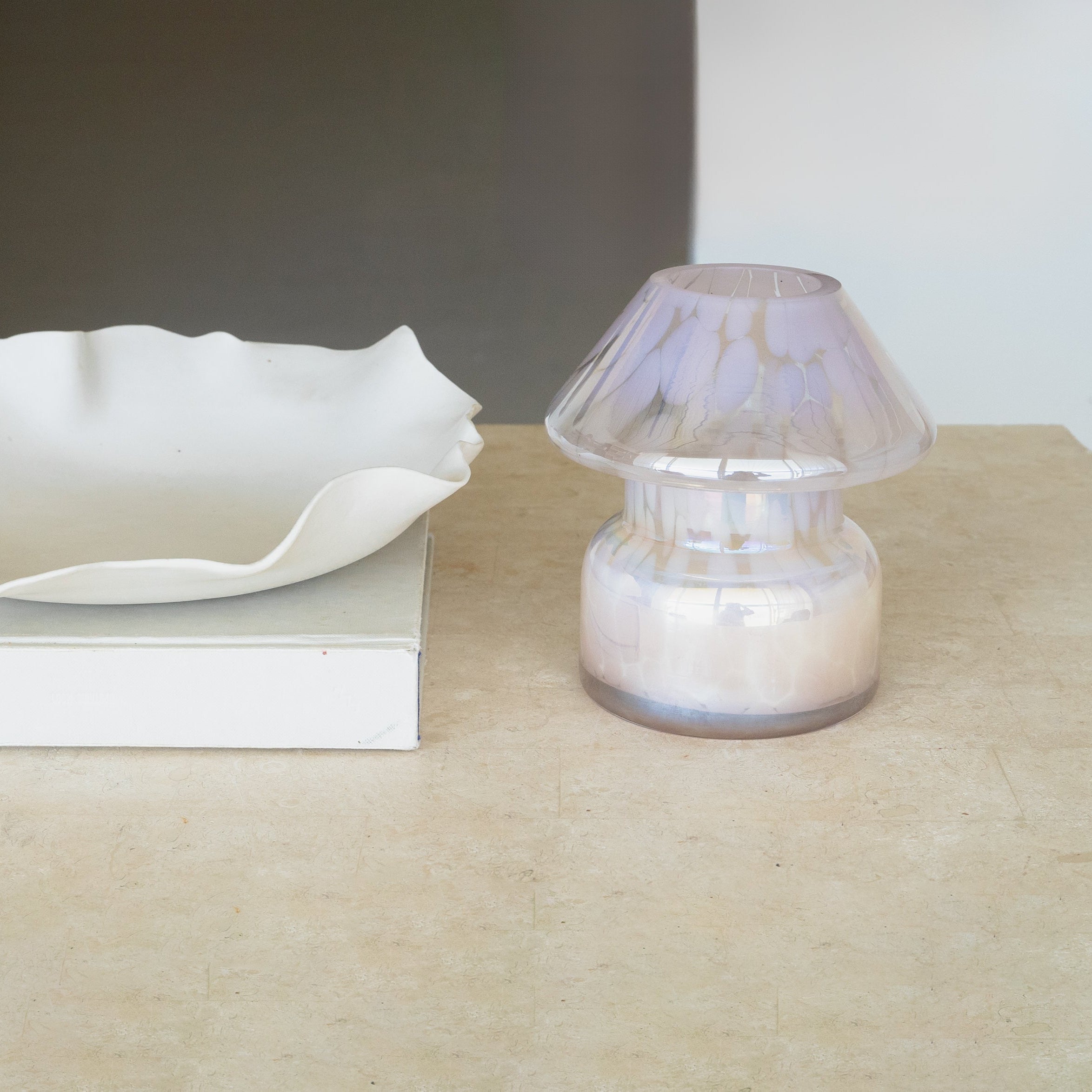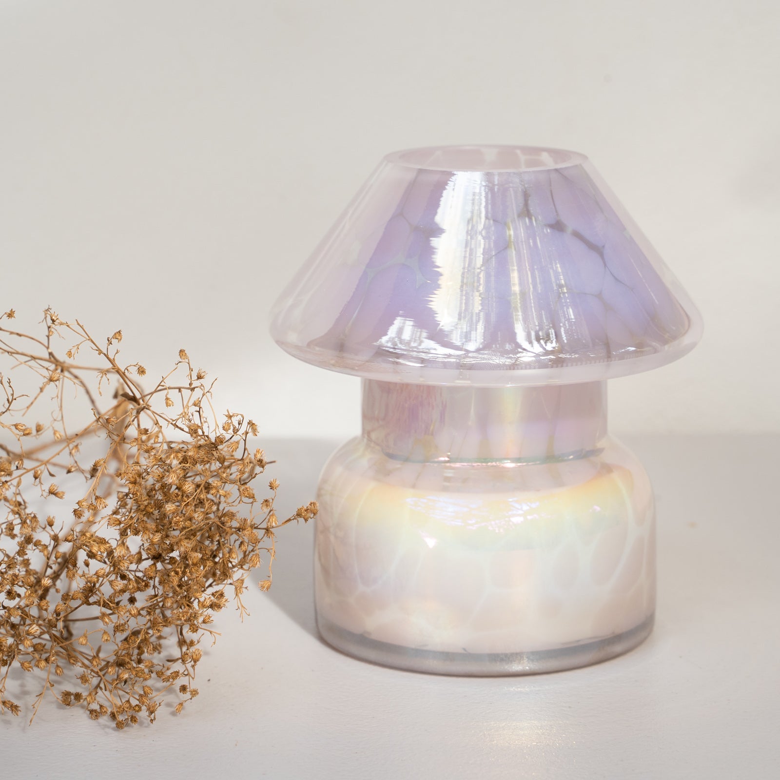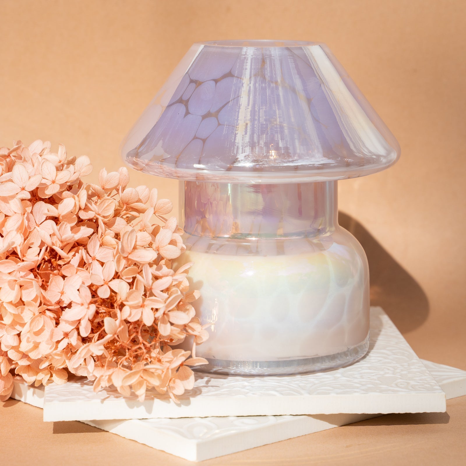 Our sustainable candle lamp is a unique piece that spices up any decor. With a retro aesthetic, mushroom-shaped glass construction, and a 100% soy wax candle inside, this lamp will fill your home with a luxurious aroma. Let a flame or sunbeam pass through the glass and marvel at the beautiful shades of light in your space. When the candle has been used, place our candle refills in and keep your lamp twinkling and your home smelling divine. Or, use it as a vase and inject a burst of color with fresh flower cuttings.