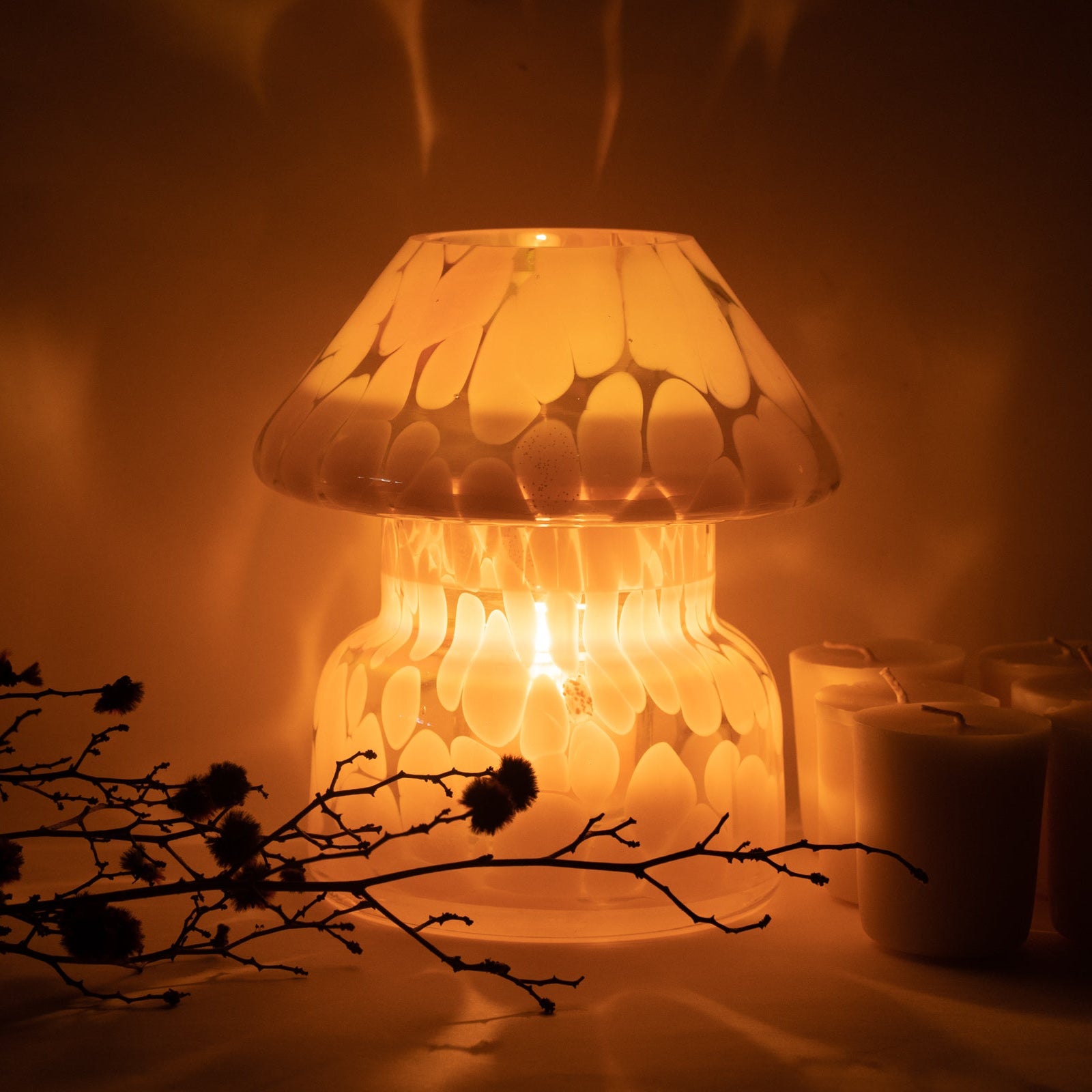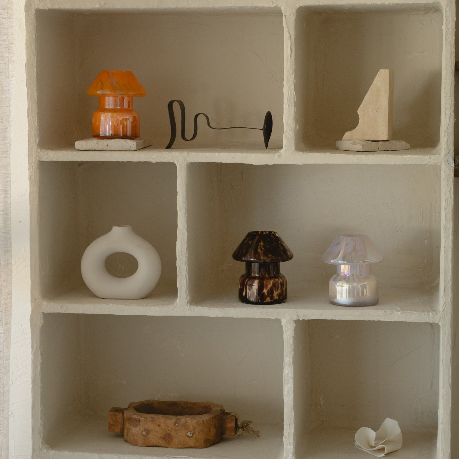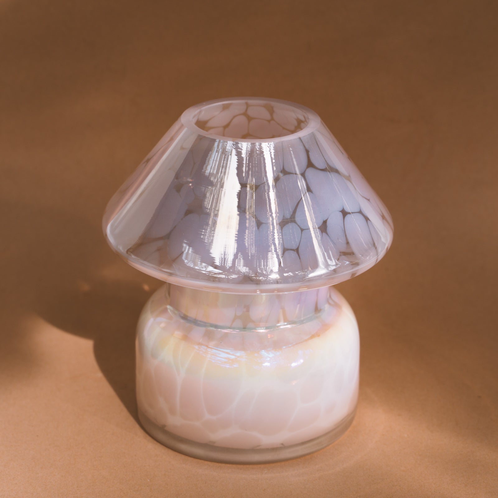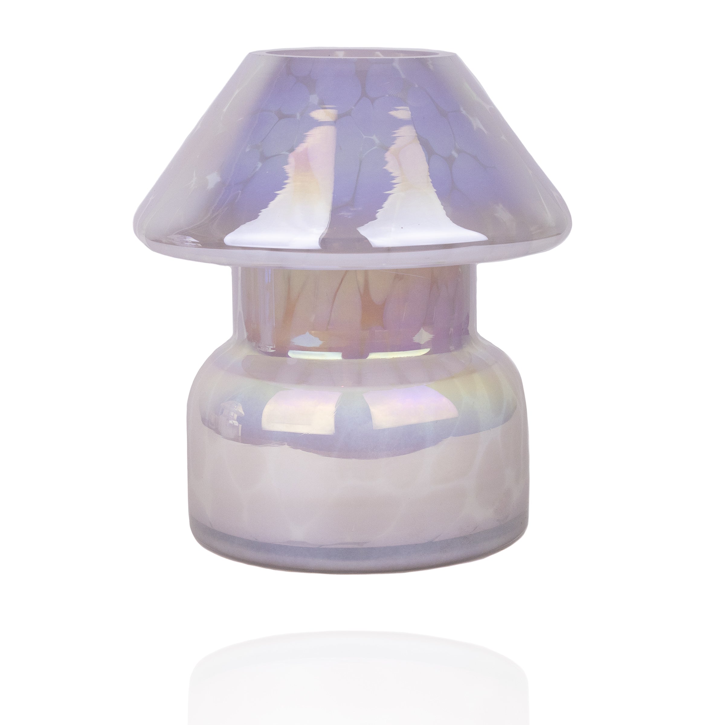 Our sustainable candle lamp is a unique piece that spices up any decor. With a retro aesthetic, mushroom-shaped glass construction, and a 100% soy wax candle inside, this lamp will fill your home with a luxurious aroma. Let a flame or sunbeam pass through the glass and marvel at the beautiful shades of light in your space. When the candle has been used, place our candle refills in and keep your lamp twinkling and your home smelling divine. Or, use it as a vase and inject a burst of color with fresh flower cuttings.