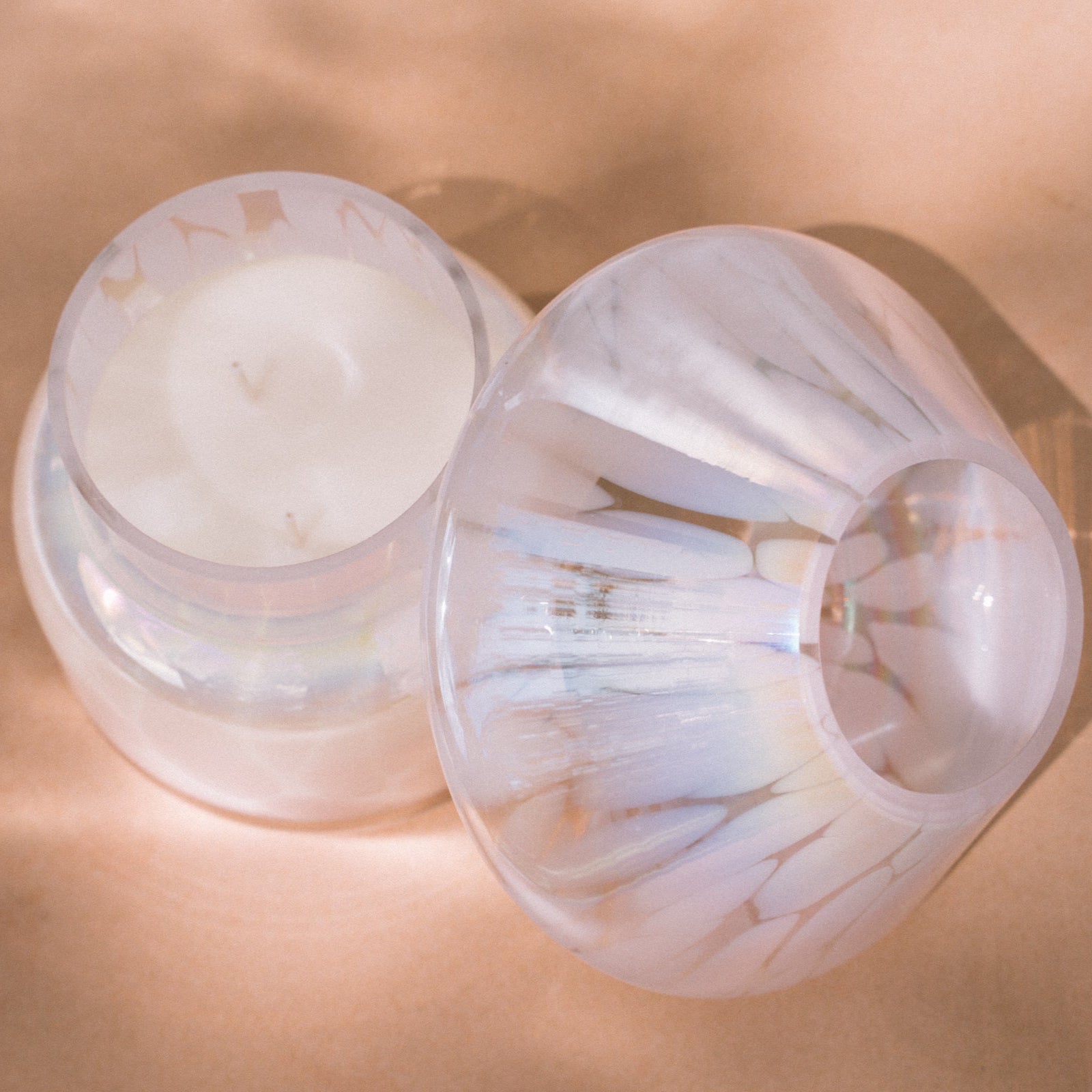 Our Euphoria candle lamp has soft pink and purple markings and also has a pearlescent rainbow tint. Every print is different and unique with differing tint density. Our candles are hand poured in Byron Bay.