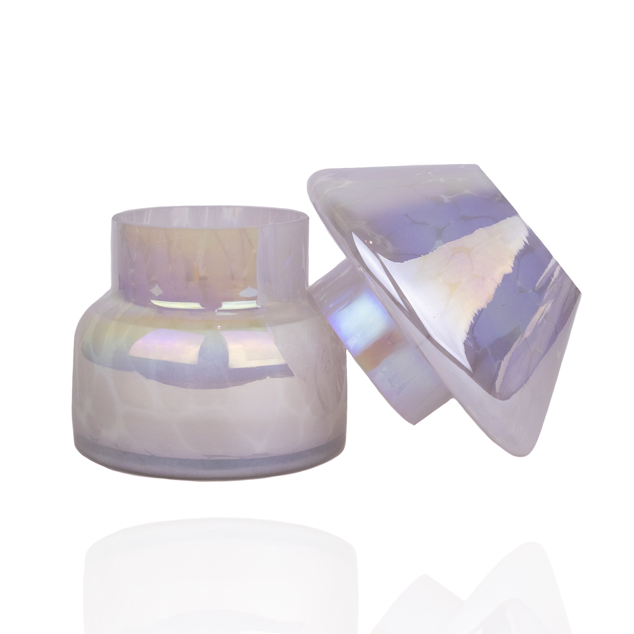 This jar has been hand moulded with glass to be heat resistant, then hand cast to create the top. This glass candle lamp has been tinted to give it an opal effect.